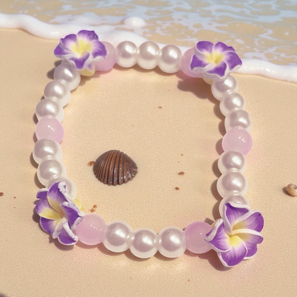 Purple plumeria and pearls give a peaceful vibe in a storm.