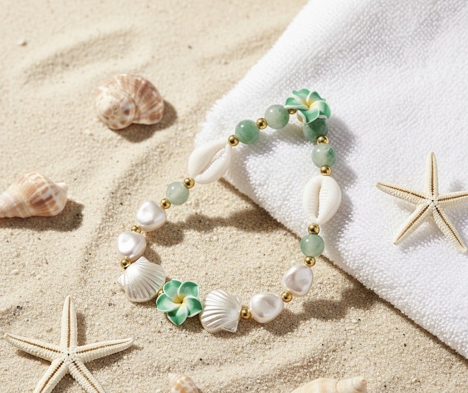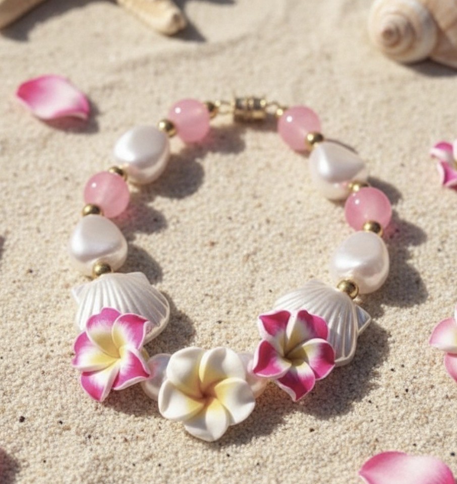 Green plumerias with seashells and white gems to give love to Mother Nature.